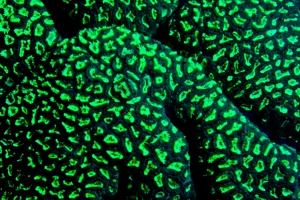 Die Korallen leuchten durch Pigmente, die eng mit dem Grün Fluoreszierenden Protein (GFP) verwandt sind. |